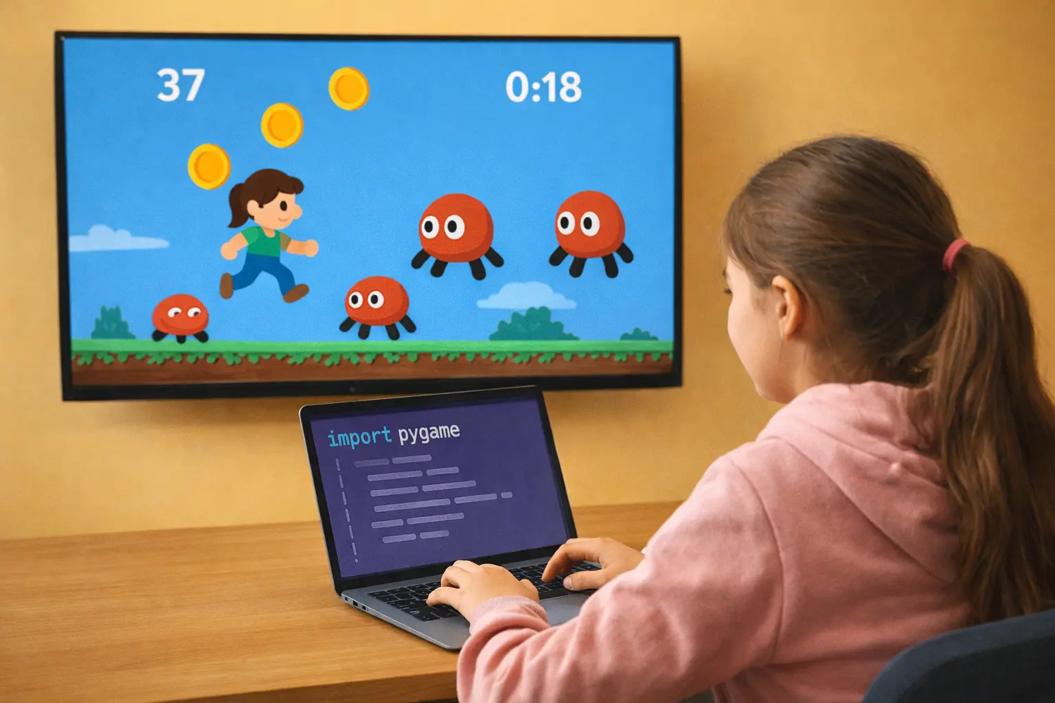 In diesem Kurs entwickeln Mädchen gemeinsam ein eigenes kleines Arcade-Spiel mit Python und PyGame. Schritt für Schritt lernen die Teilnehmerinnen, wie man eine Spielfigur steuert, Münzen einsammelt und dabei geschickt Gegnern ausweicht. Ziel ist es, innerhalb einer bestimmten Zeit möglichst viele Punkte zu sammeln.