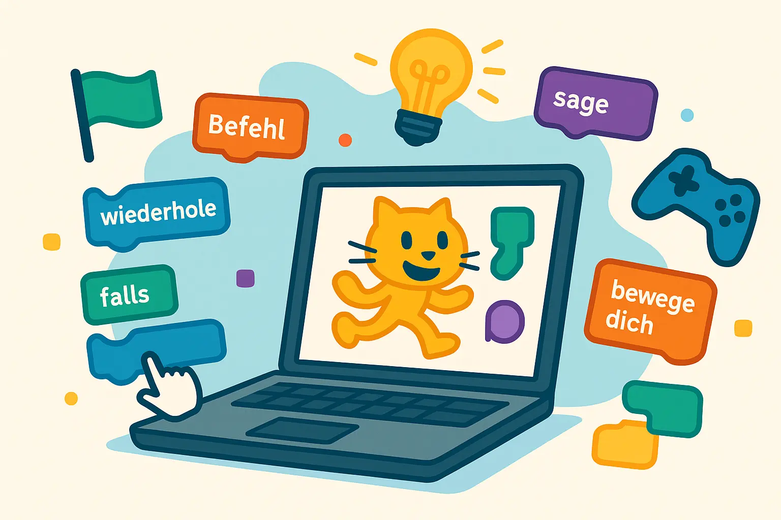 Im Workshop „Einstieg in Scratch“ entdecken die Kinder die spannende Welt der Programmierung! Mit den farbigen Code-Blöcken von Scratch erstellen sie eigene kleine Spiele, Animationen und interaktive Geschichten. Dabei bringen sie Figuren zum Laufen und Sprechen, lassen Ereignisse per Tastendruck oder Mausklick auslösen und experimentieren mit Bewegung, Geräuschen und einfachen Logiken.